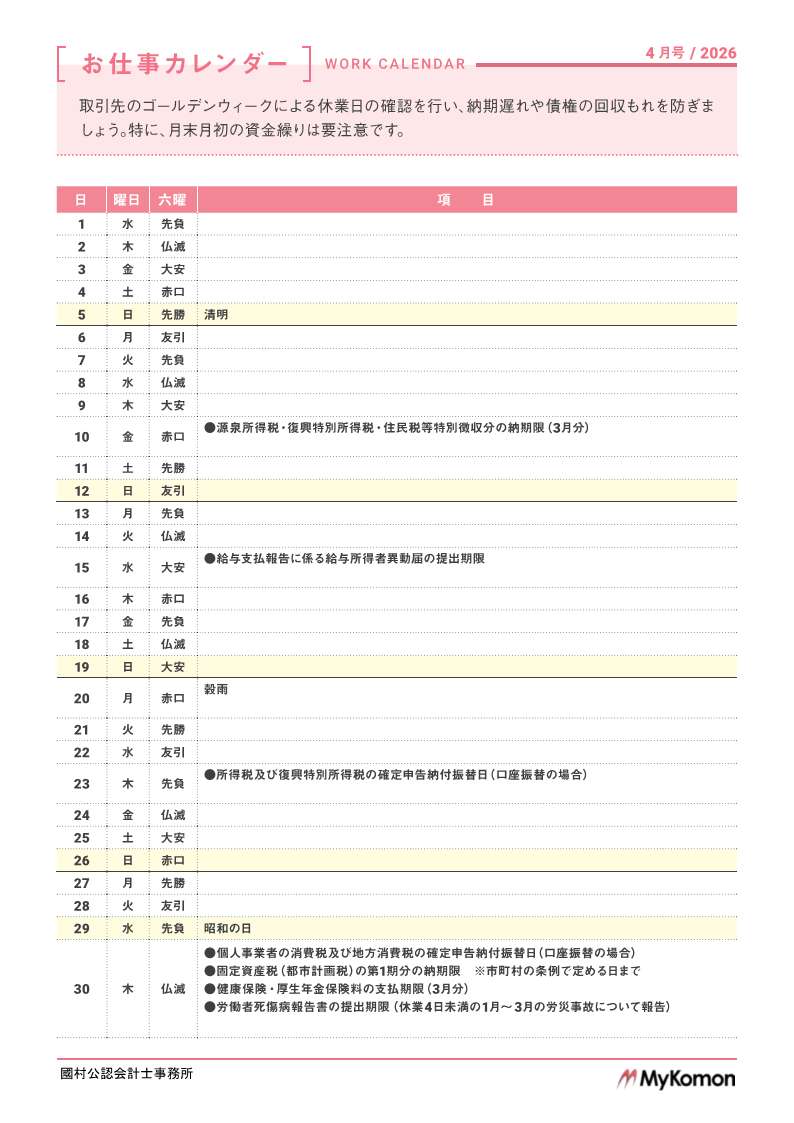 ★お仕事カレンダーのPDFはこちら⇒ お仕事カレンダー202604